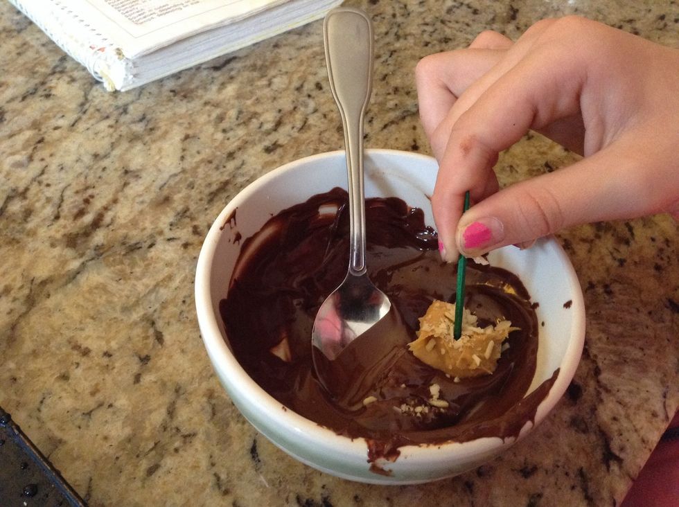 Dip your balls into the chocolate or spoon and put them back into the freezer for 15 minutes
