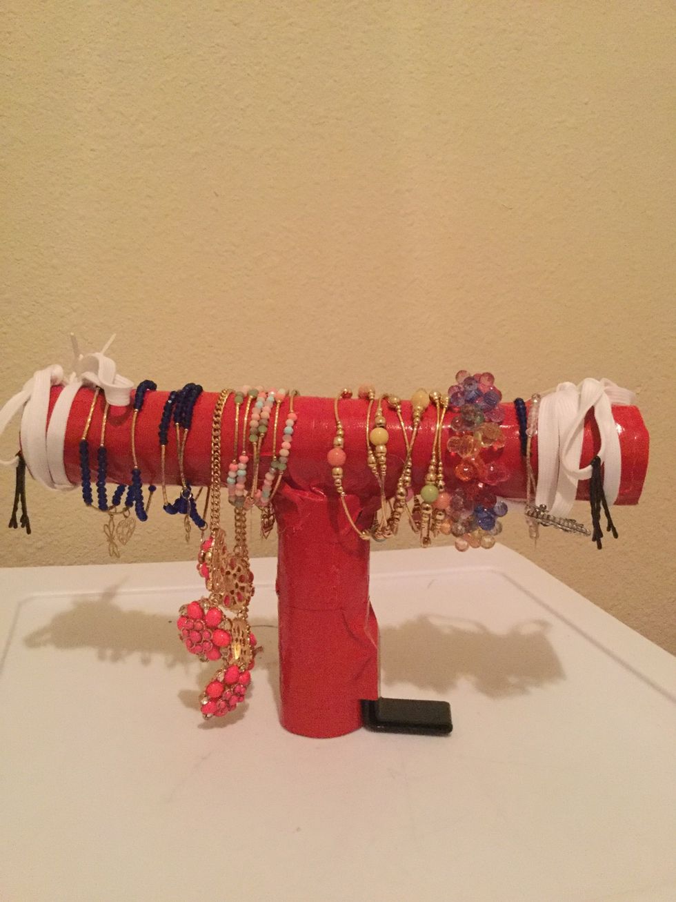 Now wrap the bigger roll with tape or cover with paint and with shoelace or Ribon make a bow so the bracelets won't fall off.