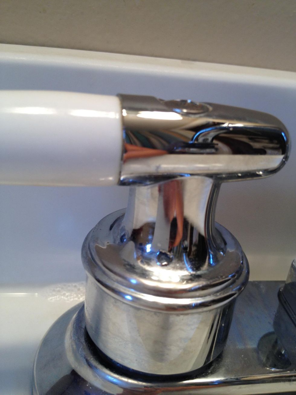 Crusty faucet. Notice the build up on the HOT water handle. I've tried CLR (calcium lime & rust) remover and other things on this, nothing has worked.