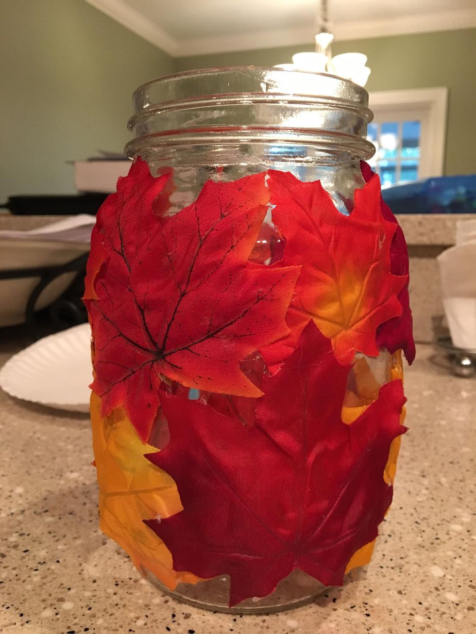Repeat steps 3-5 by placing and gluing leaves all over your mason jar.