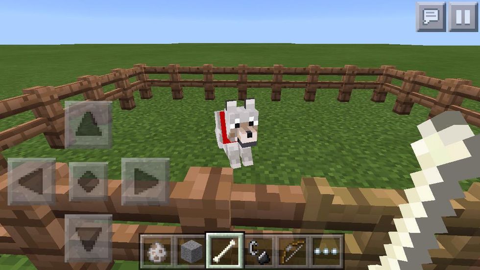 Make a fenceThen delete a block and put down a gateGet a wolfThen get a boneThen make a wolfTake the bone and press tame
