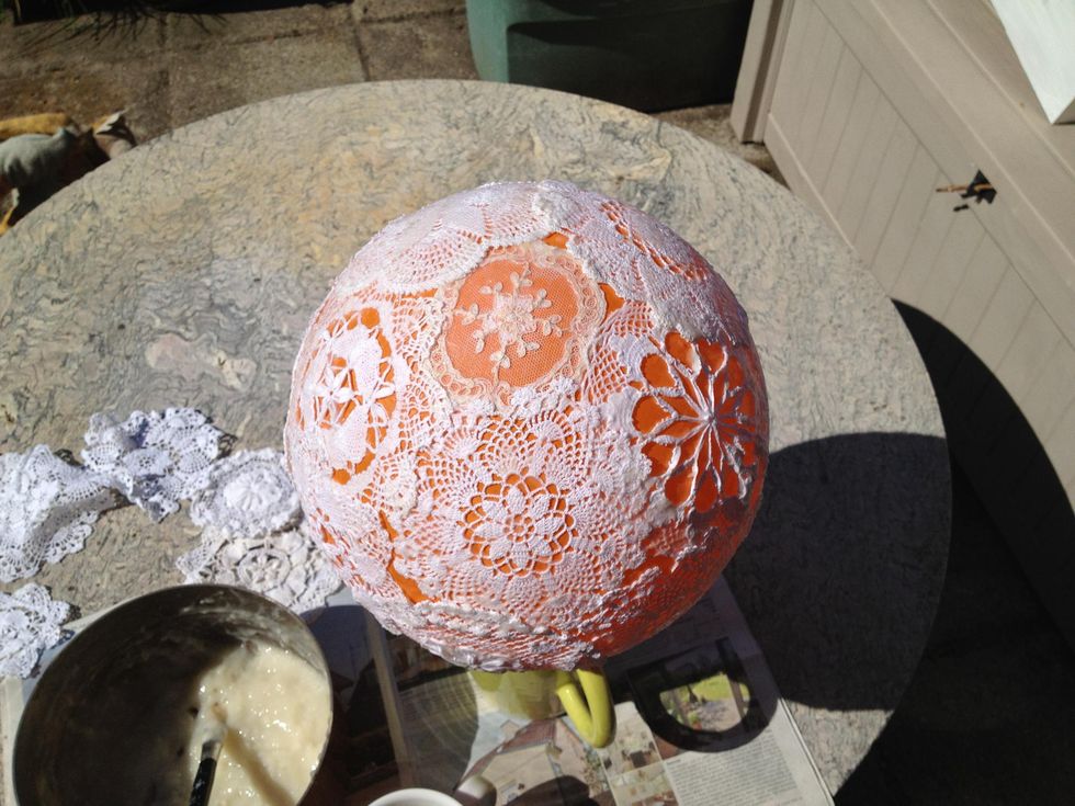 I placed the doilies on the ballon and brushed on the glue. The doilies are overlapping so that they stay together when I deflate the ballon.