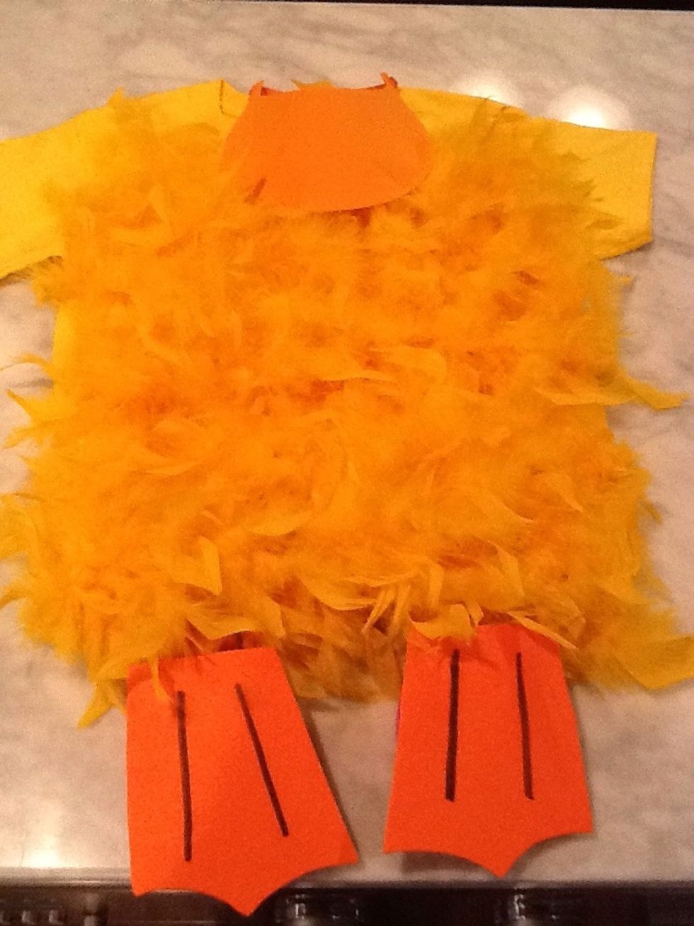 Cut the Yellow Boa to the width of the shirt and hot glue down in several places.