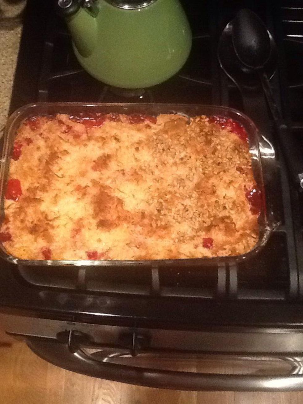 Next take a 9 by 13 dish. Then dump and spread the cherry filling in the dish.