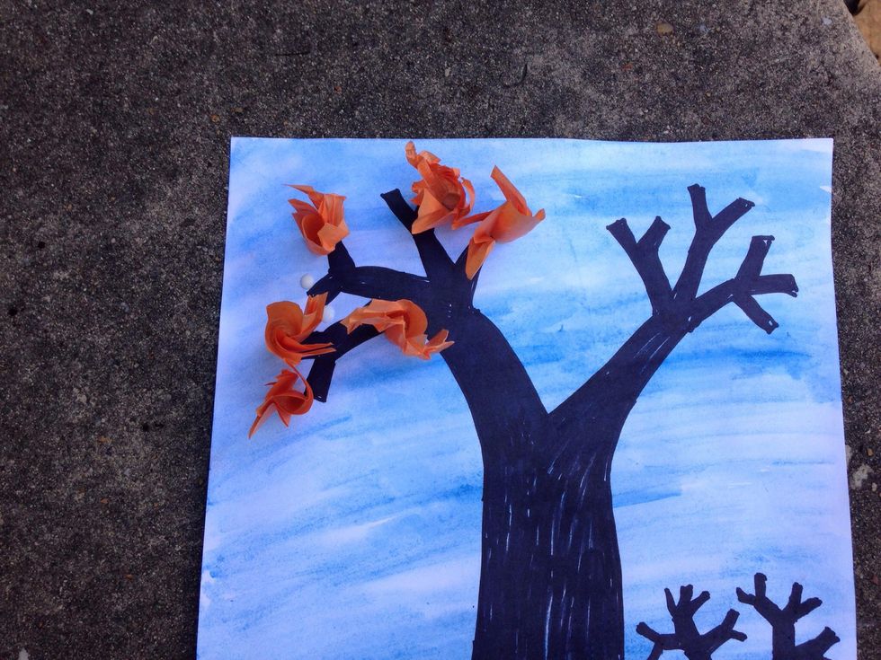 Make a tree drawingWrap tissue paper around pencil eraser.Put small amount of glue on a branch.Stick the tissue paper on the glue.Add on more leaves.