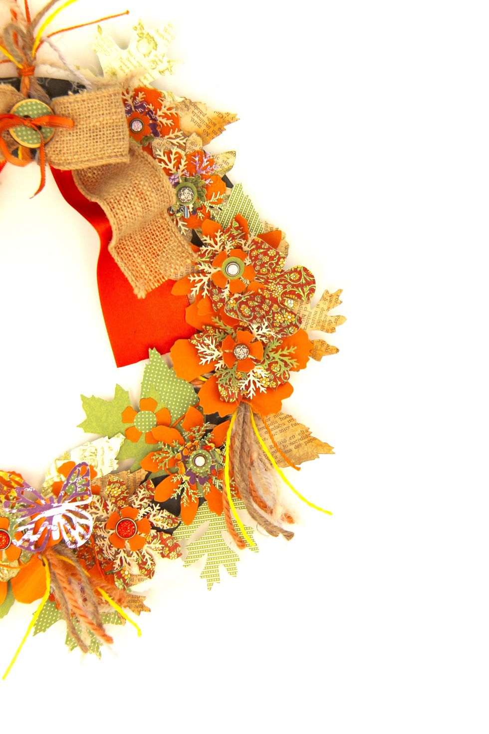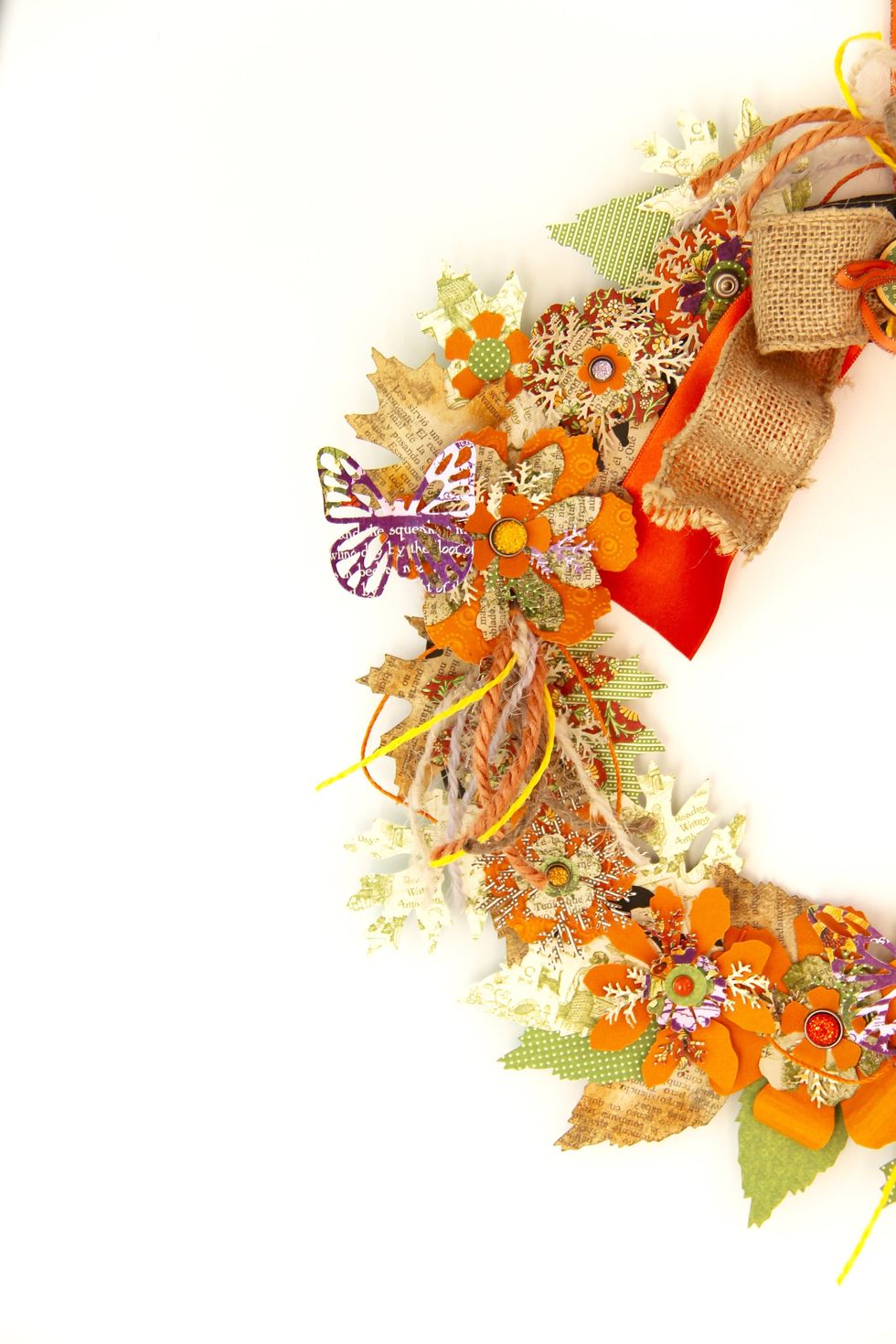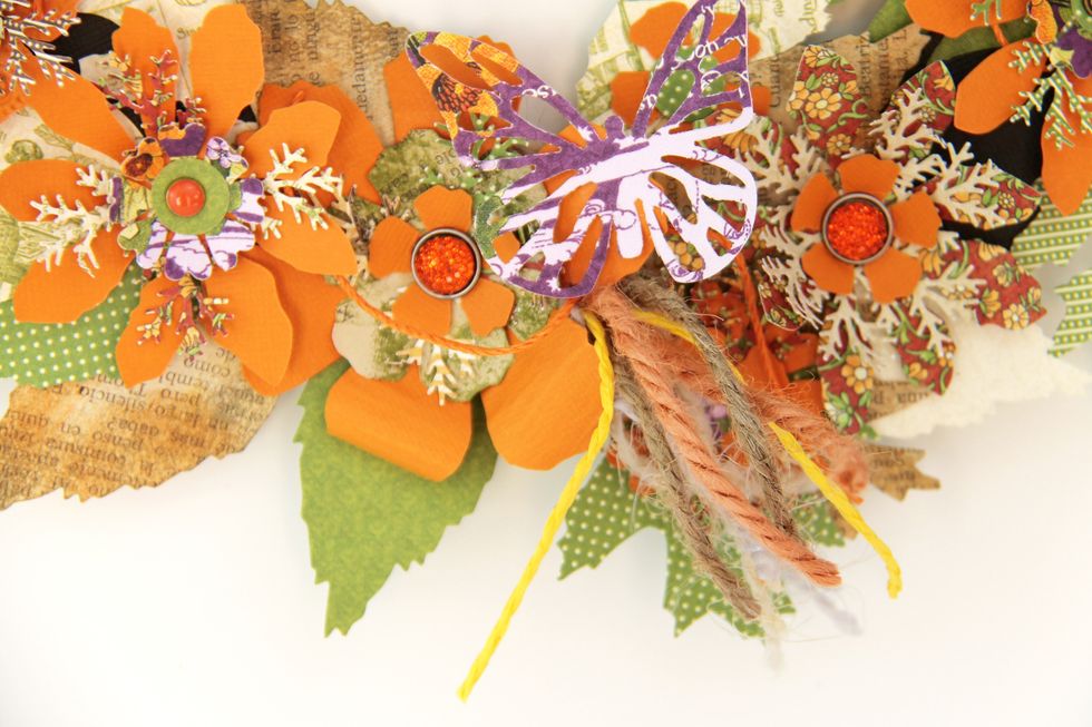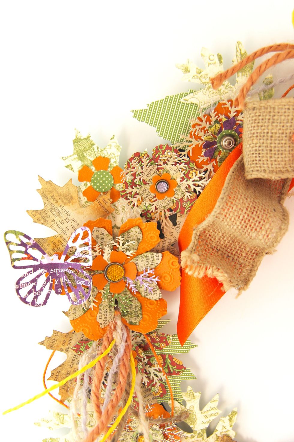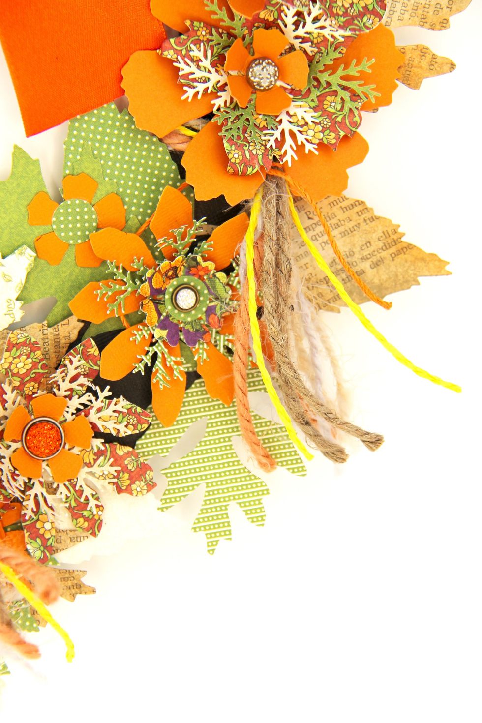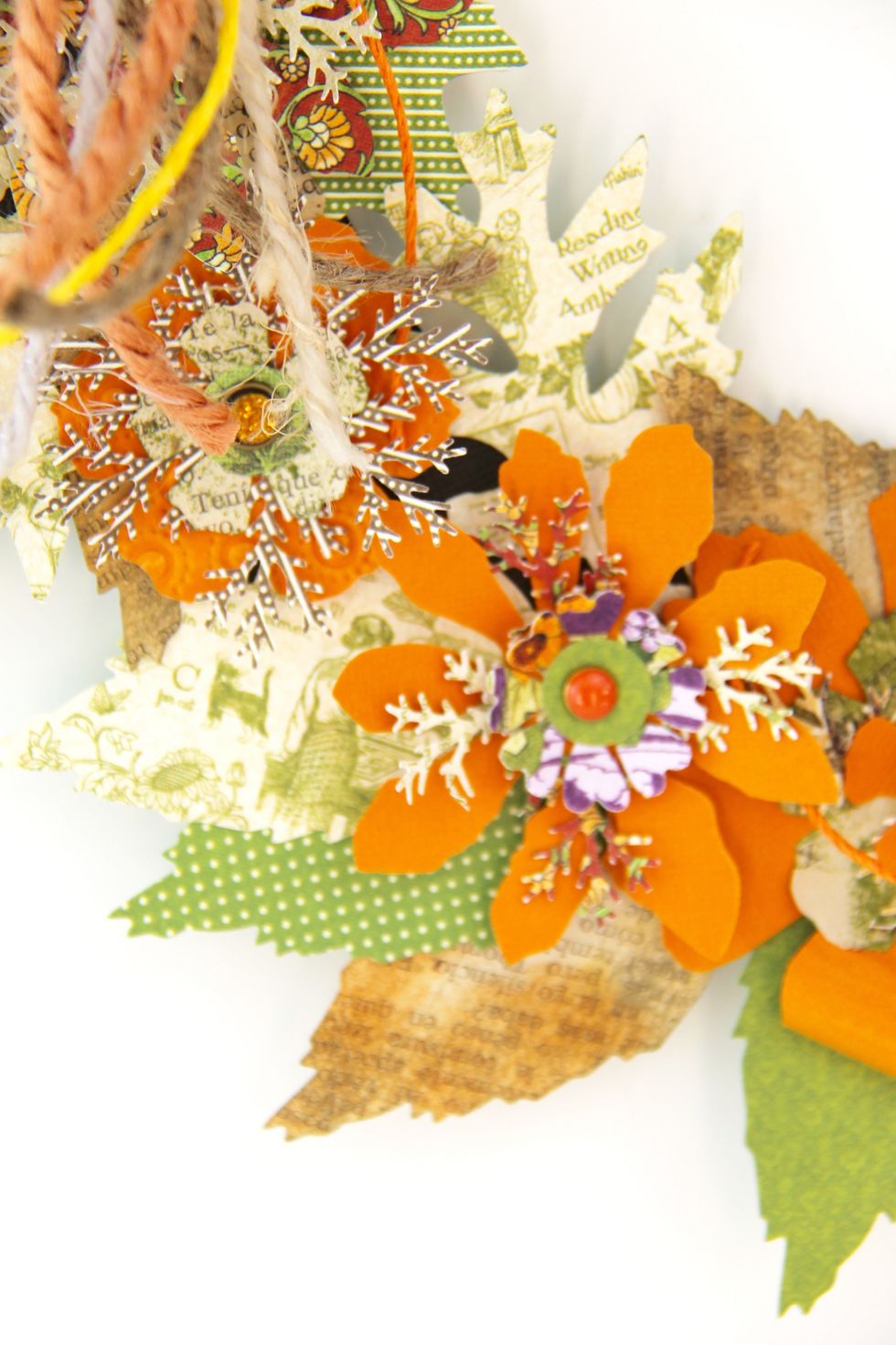 Make flowers using several elements and a brad and glue on the wreath as you like.