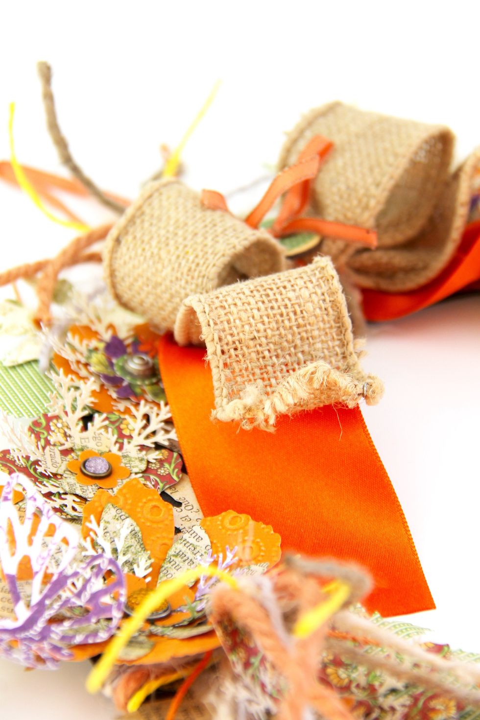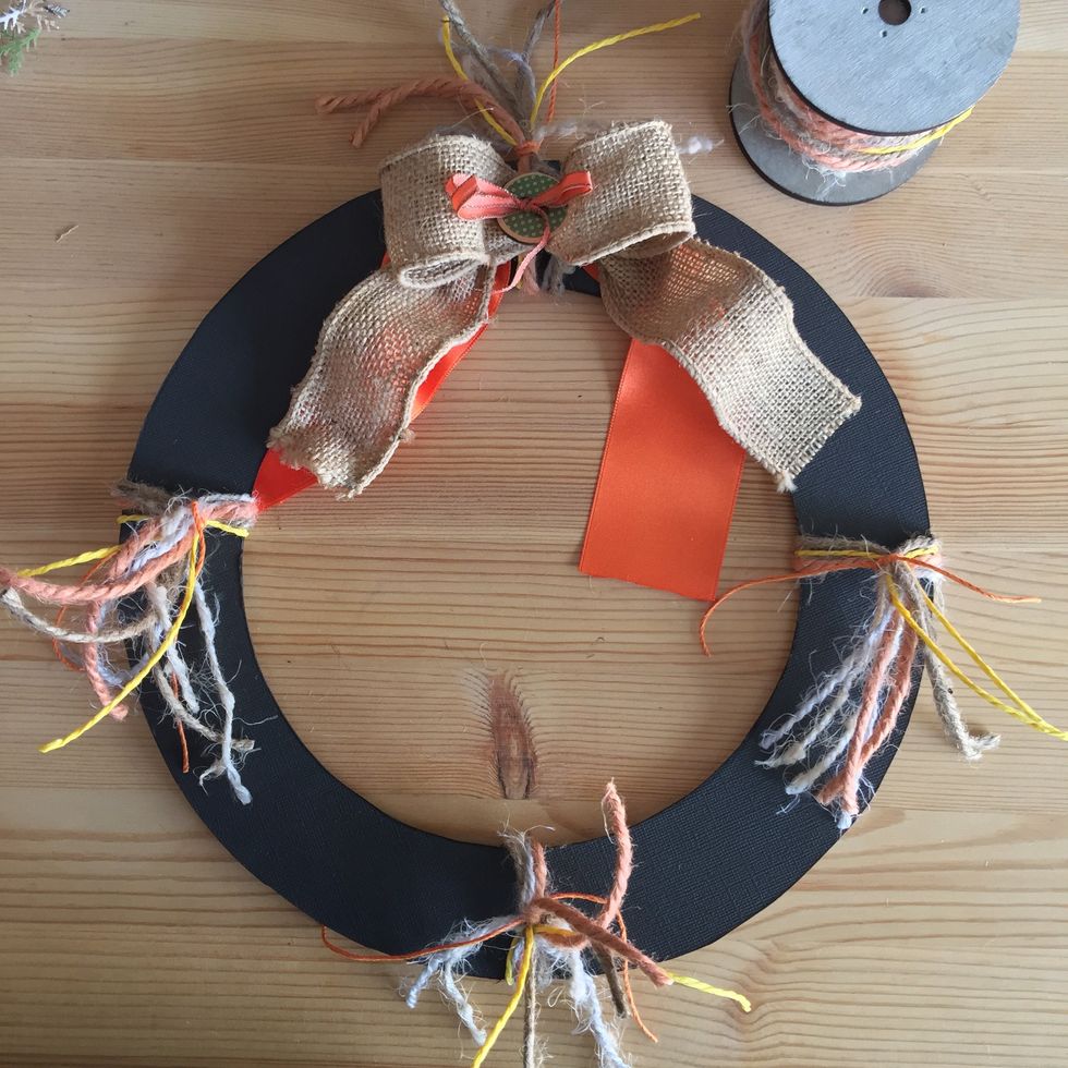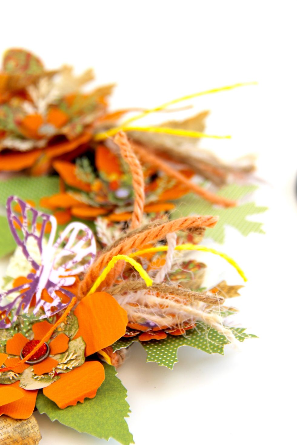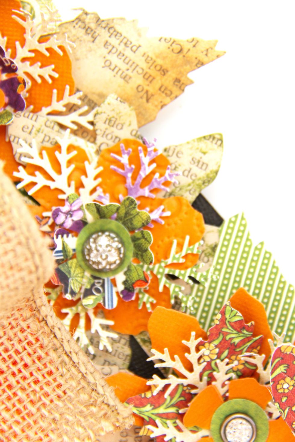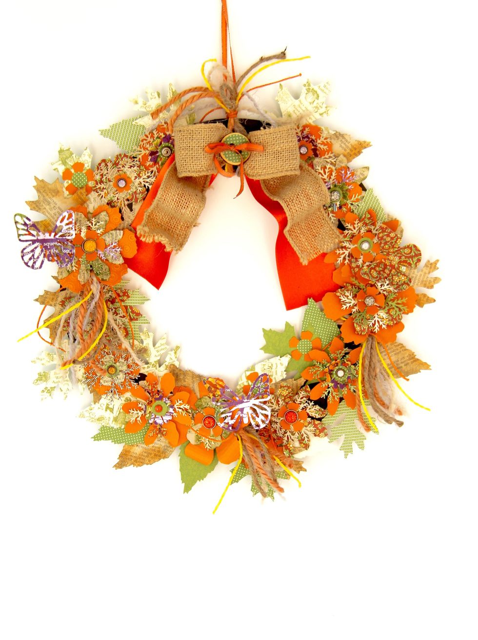 Make flowers using several elements and a brad and glue on the wreath as you like.
