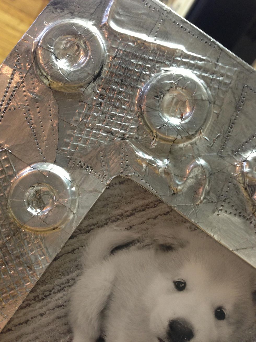 Embellishments used on this frame. drywall patch tape, hot glue and old jewelryTape is applied in small piecesPepper when he was a puppy