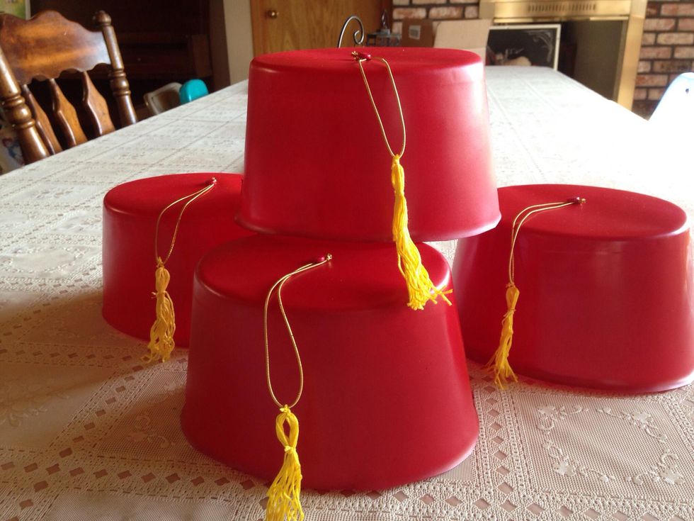 Find a spot outside protected by the wind and spray a coat of red paint evenly over hat. Allow to dry. Do this three to four times, allowing to dry between each coat.