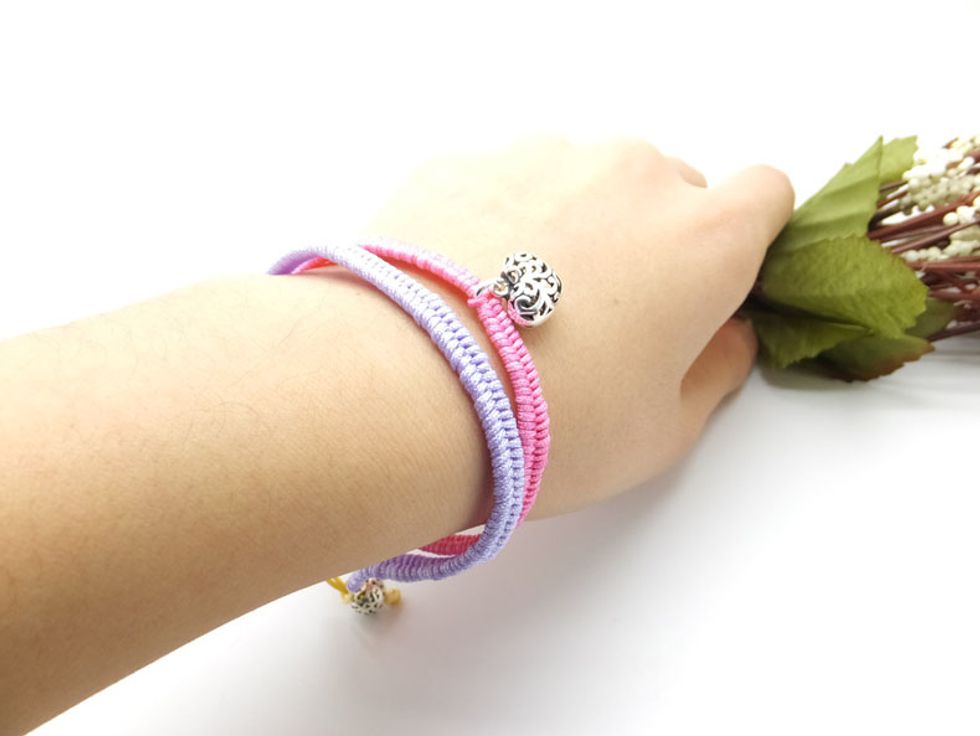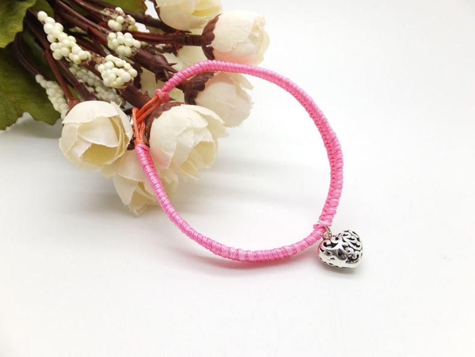 Keep working in the same pattern (over-under-pull, over-under-pull) until you reach the half length of your wrist. Then string a heart-shaped charm pendant.