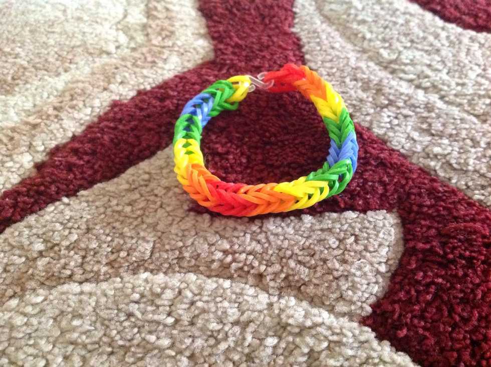 Put first band on 2 pegs. Twist in a figure 8 shape.Add 2 more layers of bands, do not twist it this time.It should look like this.Now it's done !!!!!!! :)