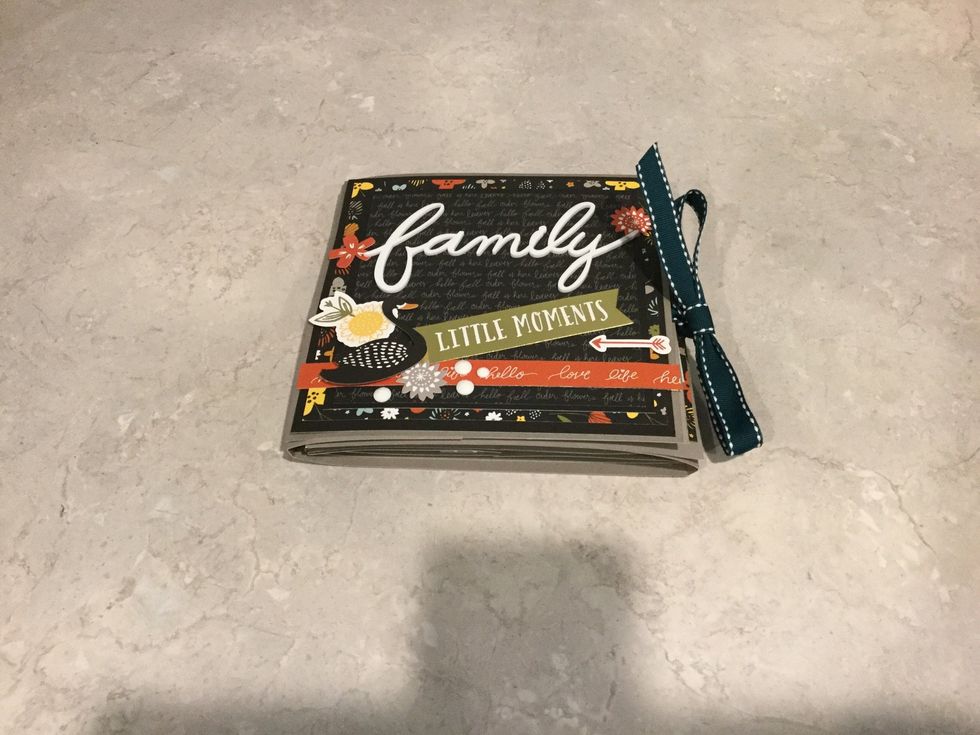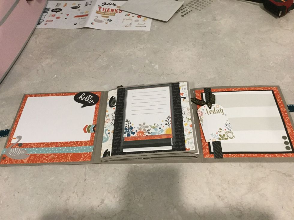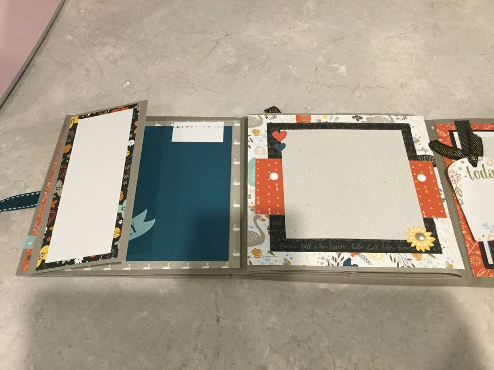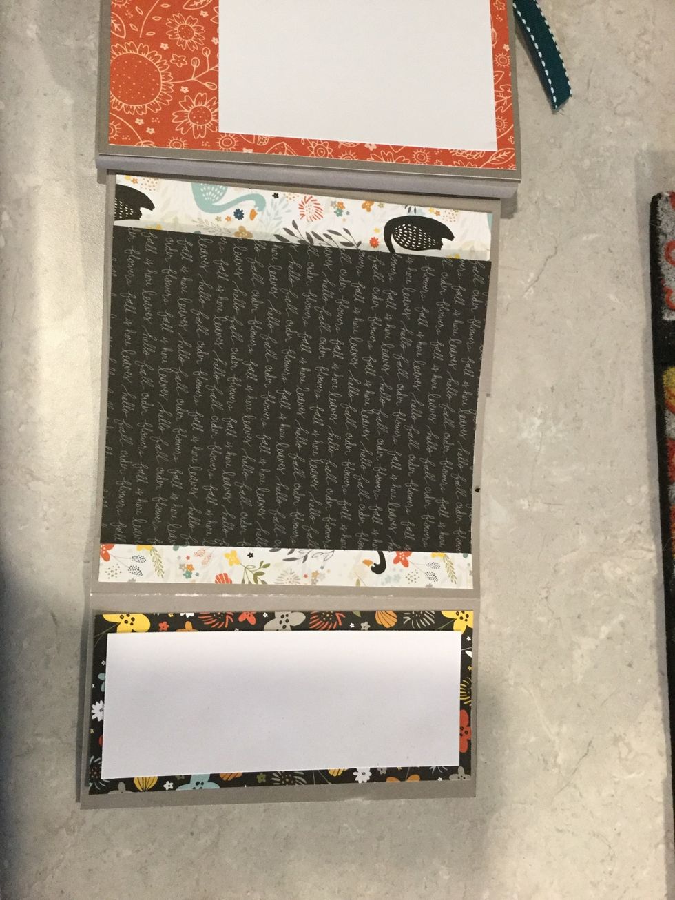 Take your 6 inch by 12 inch cover and put double sided tape just inside the middle score lines.Place the inside of your mini scrapbook onto this double sided tape.
