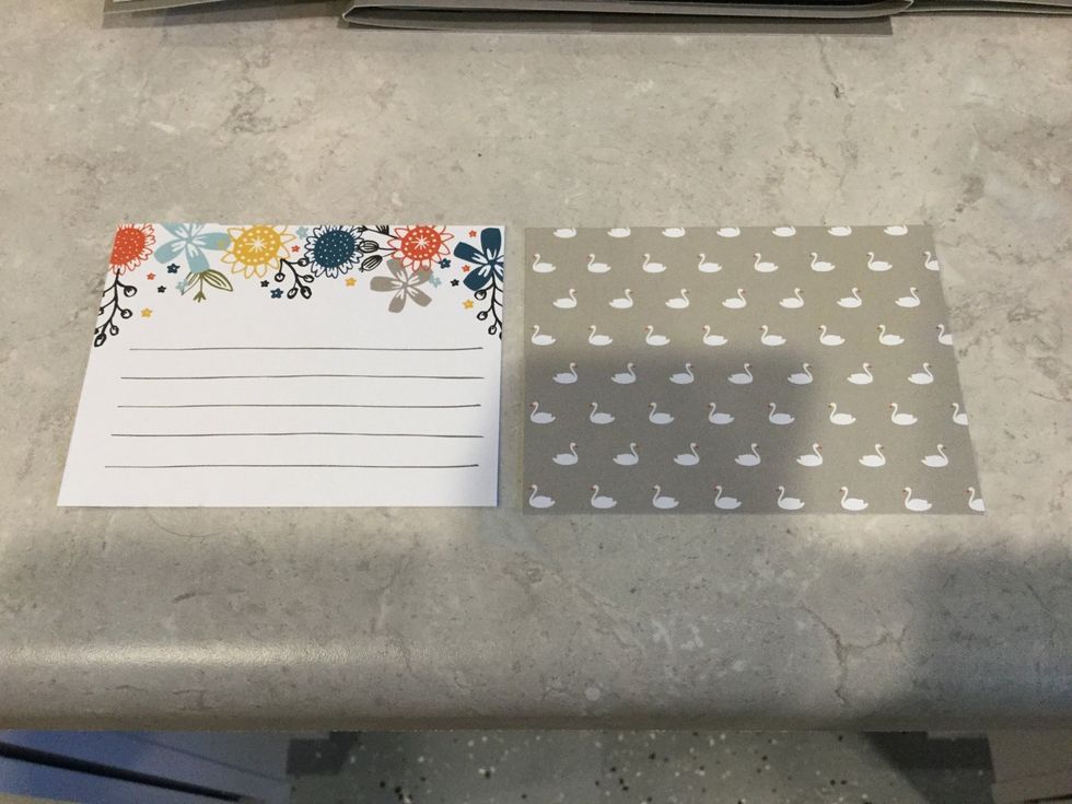 Black floral. 5 3/4 X 5 1/2. Grey dot- 2 X 5 3/4,. Red card. Trim down !