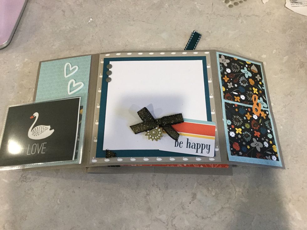 Blue texture paper 2 3/4 X 5 1/2 (cut 2- for each side. Swan texture - 5 3/4 X 5 1/2. Peacock cardstock- 4 X 5! Glue as shown!