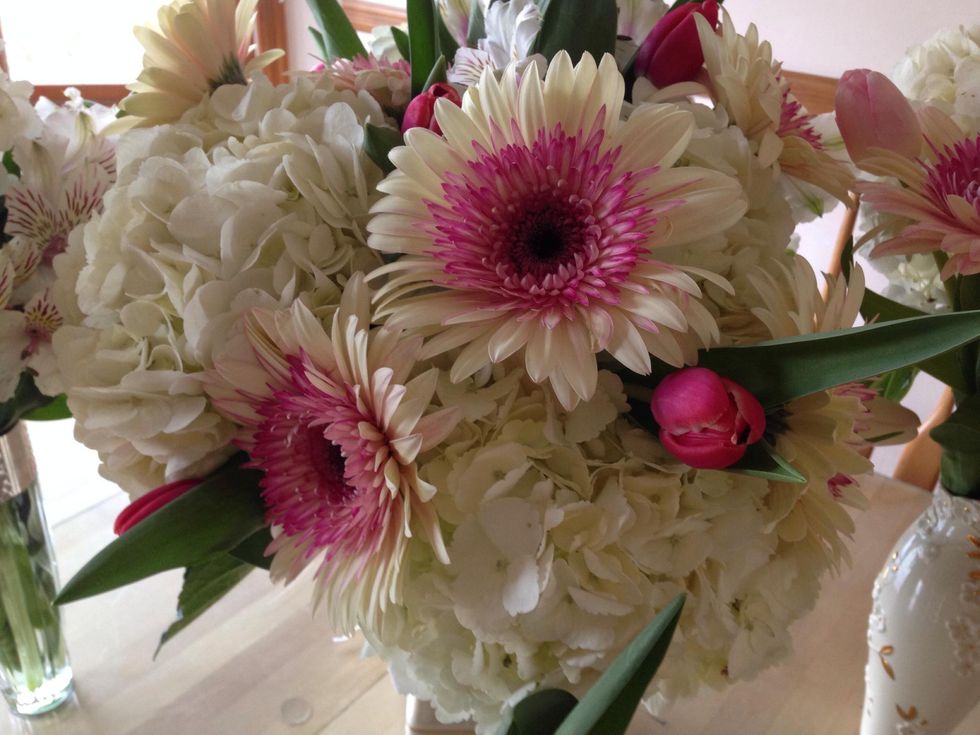 When creating a flower arrangement first choose a color palate, I am using pink and white for the bridal brunch. I am using hydrangeas, tulips, gerber daisies and alstroemerias, they are in season.