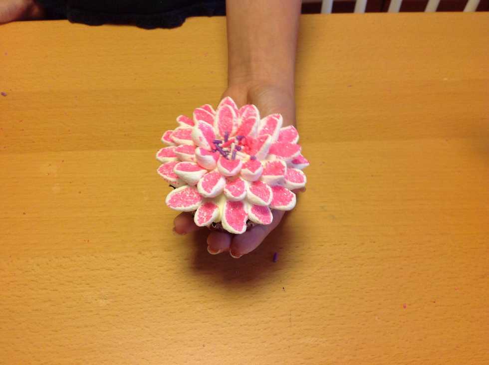 Start putting the marshmallows on the outside. Put the flat side on the frosting so it looks like petals.