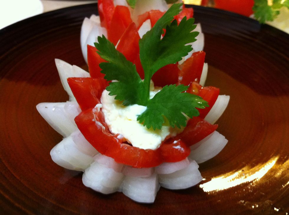 tomatoes around the cutclean out the seeds.onion cut around like tomatoes, take out the interiorNow collect the flower:1) Bow 2) tomatoes 3) Mayonnaise 4) cilantroFLOWER OF LOVE is ready.Surprise a loved one!!!!❤❤❤😍