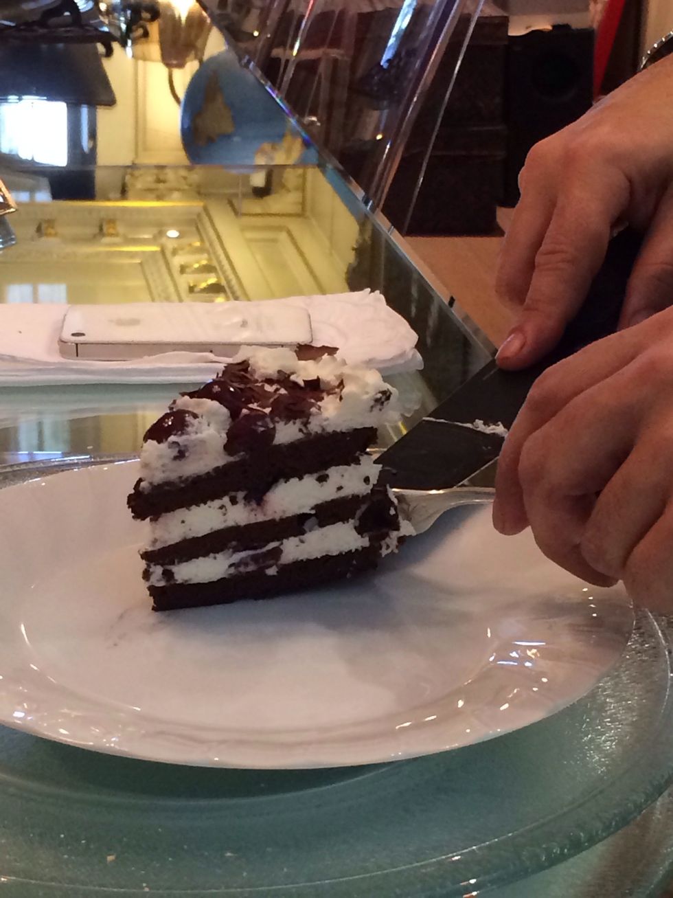 The original recipe is finished with the whiped cream covering the whole cake and decorated with some cherries and chocolate shave.
