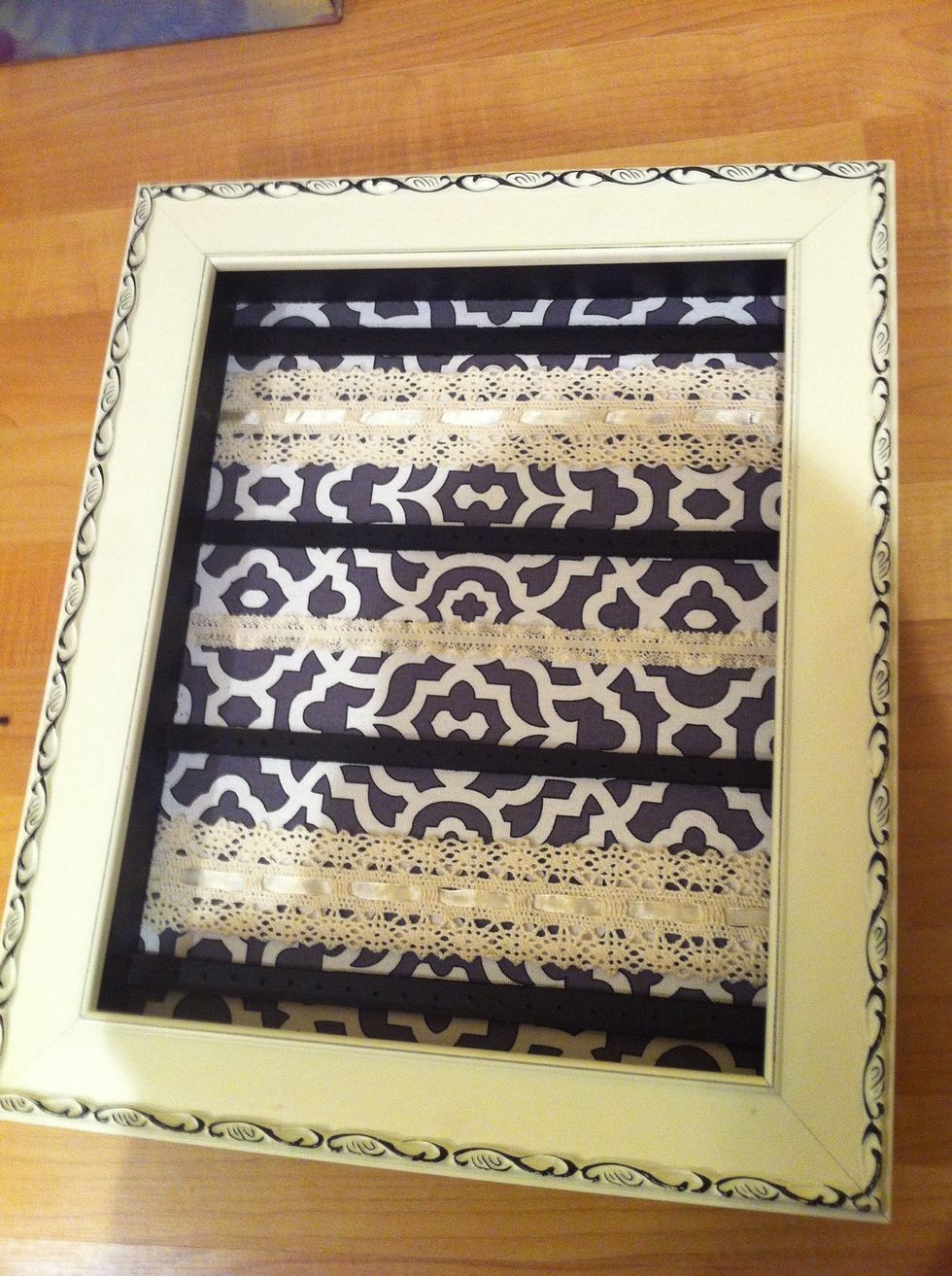 I forgot to take pics while I was making these, but I just cut pieces of wood the width of the frame, used the drill to make the small holes (where the earrings will go), & I spray painted them black