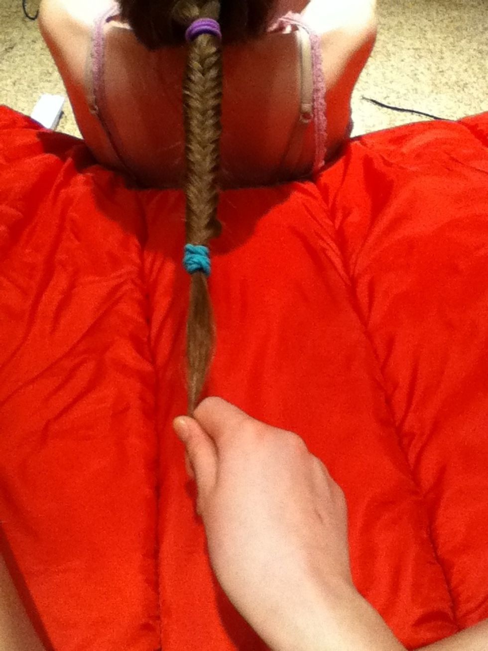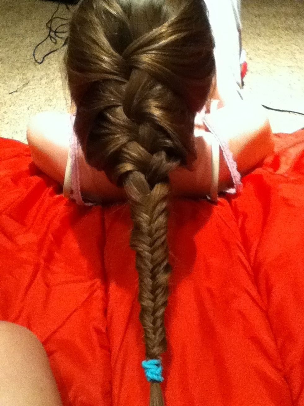 Take out the hair tie that separates the French braid and the fishtail braid.