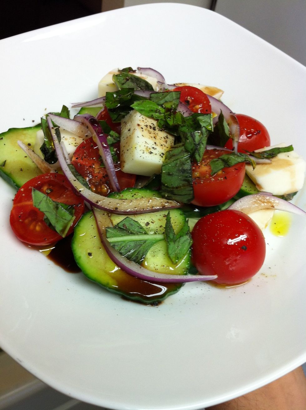 This is a twist on a classic Insalata Caprese adding cucumber and onion for a light salad, that is easy to put together. Great for the warm weather to come.