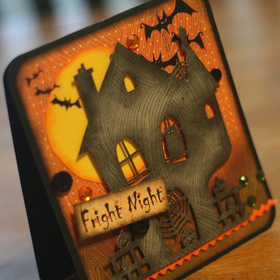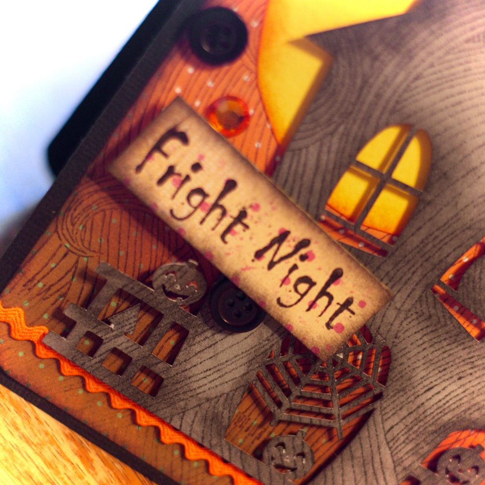 I started with a scary haunted house that I cut from my Silhouette Cameo. I sponged the edges with a black Memento Stamp Pad.