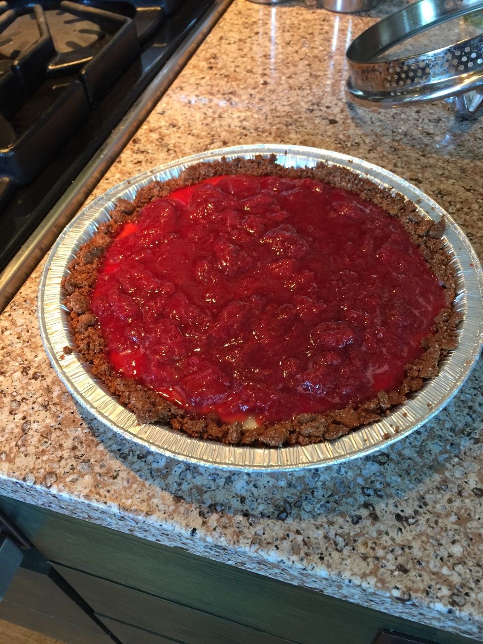 While your pie is getting frozen, make a strawberry topping. Some strawberries, I used a pint