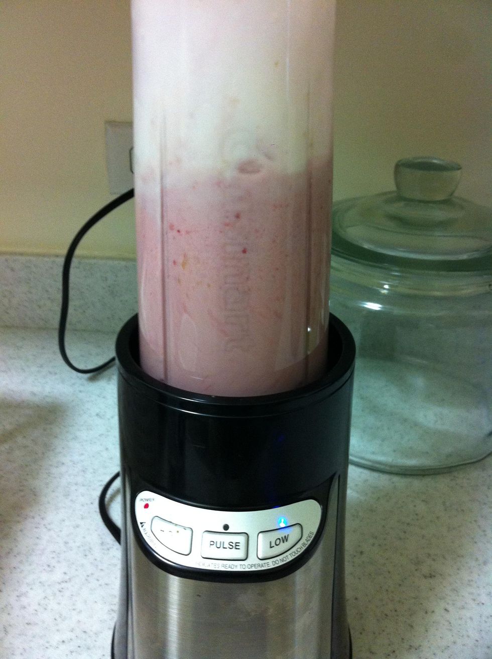 Gather the suppliesAdd the yogurt to the blender cupAdd the frozen strawberriesAdd the frozen peachesAdd the protein powderAdd the POM juiceBlend for 1.5 minutesENJOY!!!