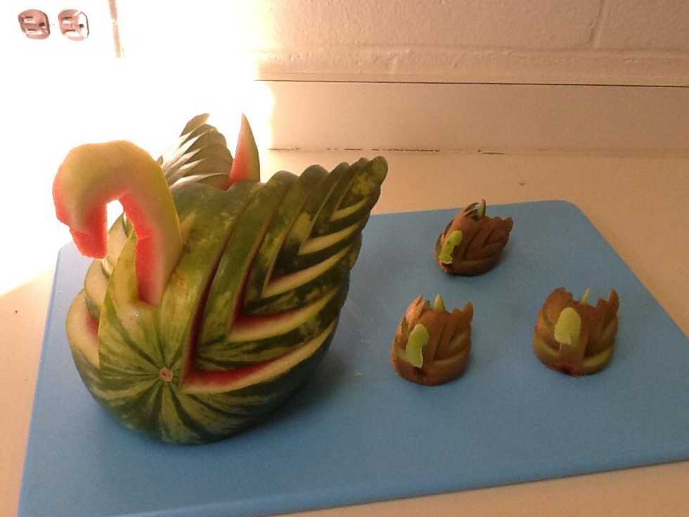Use the serrated knife to cut about 1/5 off one side of the watermelon. This will be the base of the mother swan. The piece you have cut off will be used for the head, so keep it.