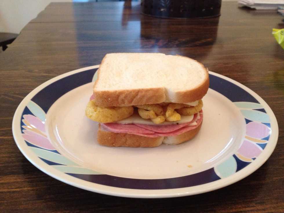 Take the other slice of bread and slightly mash it down on top to secure the Funyuns, then throw it in the microwave for about 30 seconds...