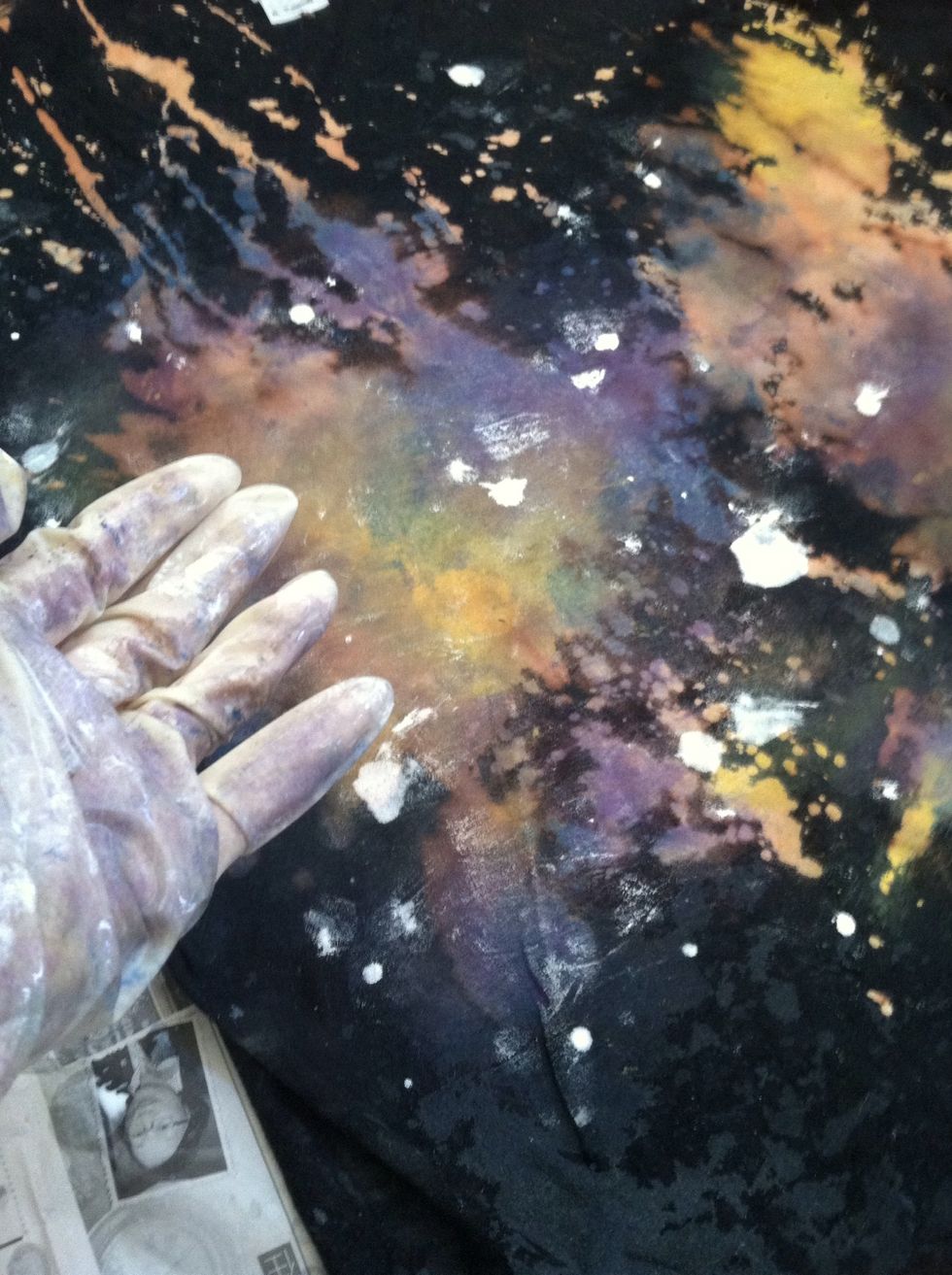 Spray bleach and water solution liberally on your shirt. It should look like this.