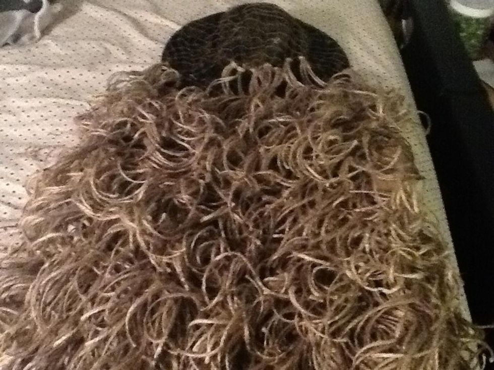 With the hat, you want the jute to hang down enough to cover your neck on all sides but the front, with shorter strands by your ears, and just enough to cover the brim of the hat for the front.