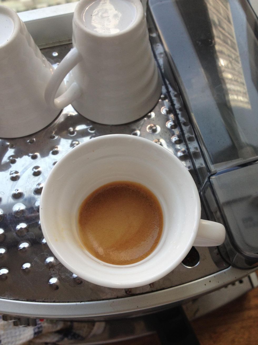 Plug in the basket, pull your shot. Take your cup away in 18-20ml. We need to keep the shot small for the best part of espresso.