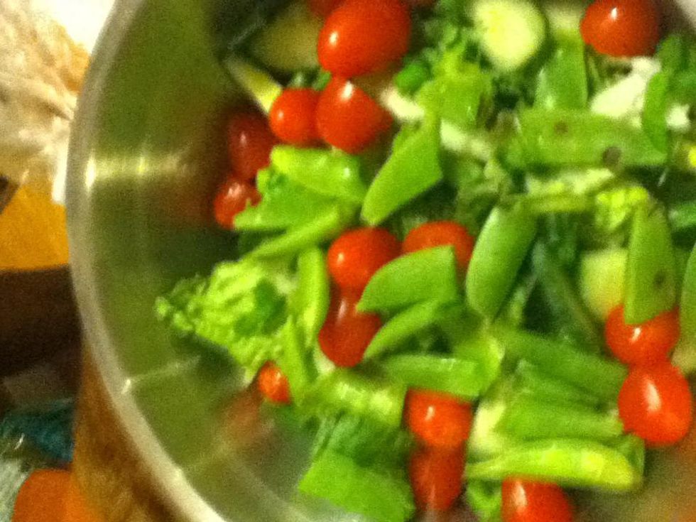 SuppliesLettuce is doneCut your cucumberStalk them upCut down the middlePut them inCut onionPut inGet and cut tomatoPut them inCut the snow peasAdd them and your done