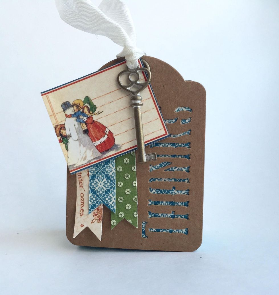 Take a 8” or longer length of seam binding and fold in half. Thread the folded end through the top of an Ornate Brass Key and then through the Snowman cutout.