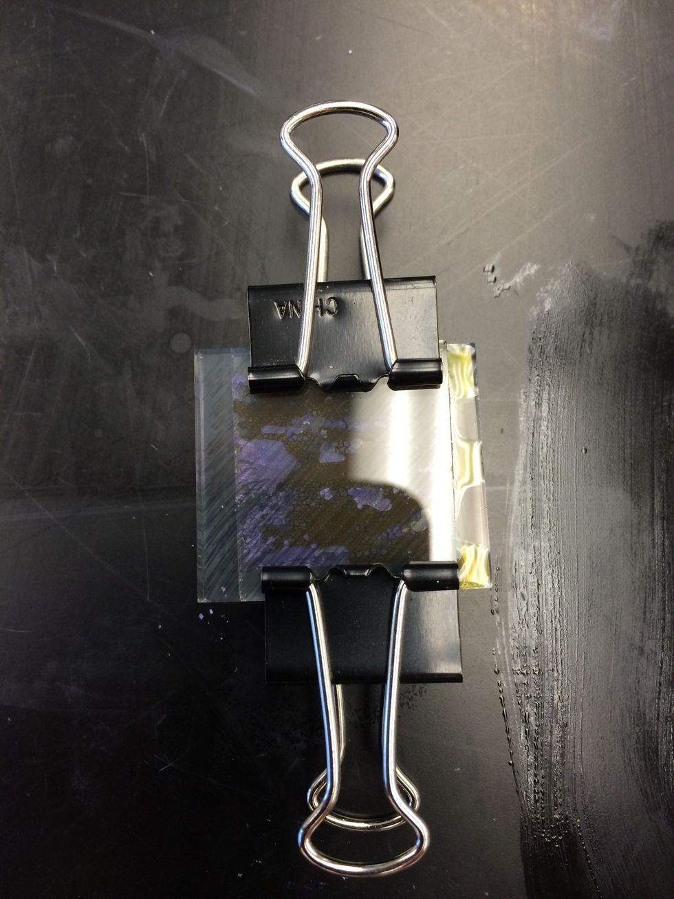 Shift the plates so that the uncoated edge of the TiO2 plate is exposed. Place two binder clips on the edges to hold the plates together.