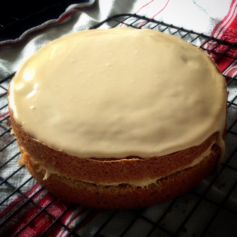 For the butter icing in the middle, cream the 50g softened butter, dissolved coffee and 100g icing sugar. For the top icing, mix the 75g icing sugar and water/coffee mixture. Spread over the top.
