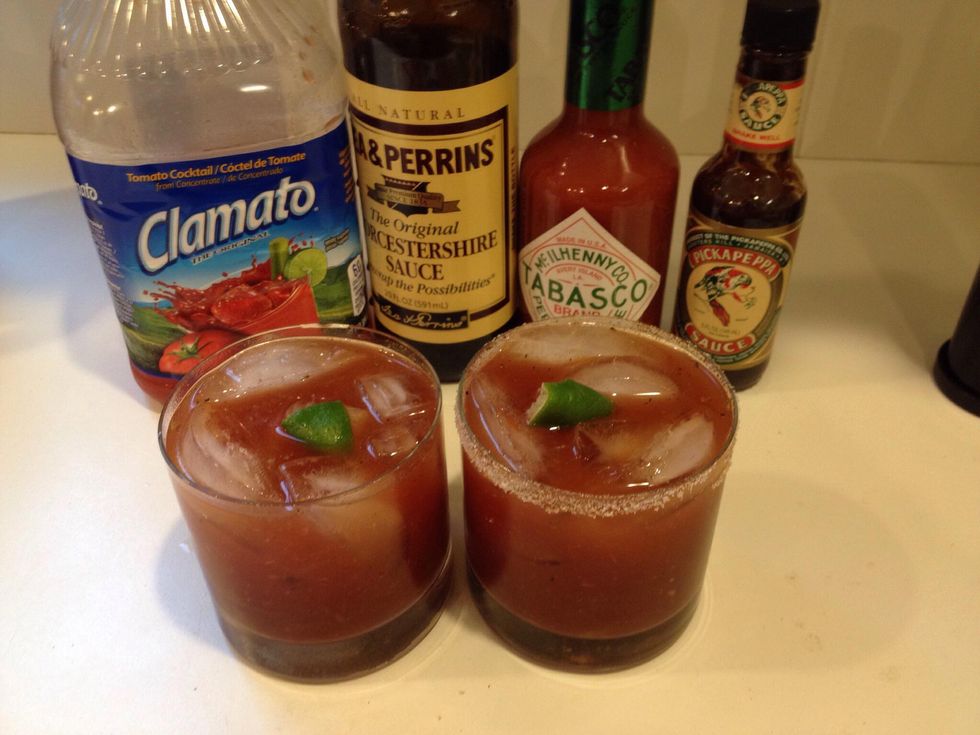 I only use Clamato juice, never tomato juice. Start by filling a carafe or pitcher with the amount you think you need. I fill it about 2/3 full and start mixing in ingredients.
