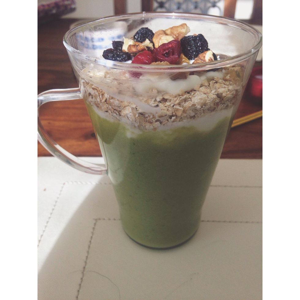 Top the smoothie with 2 tablespoons of oats, 1 tablespoon of yogurt and dried fruit & nuts.