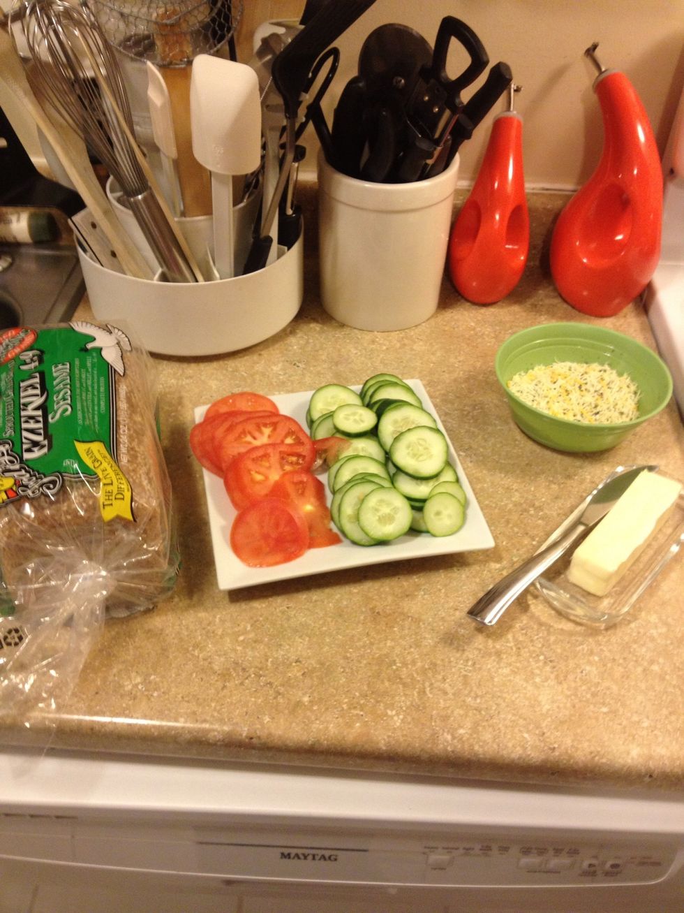 Slice tomatoes and cucumbers