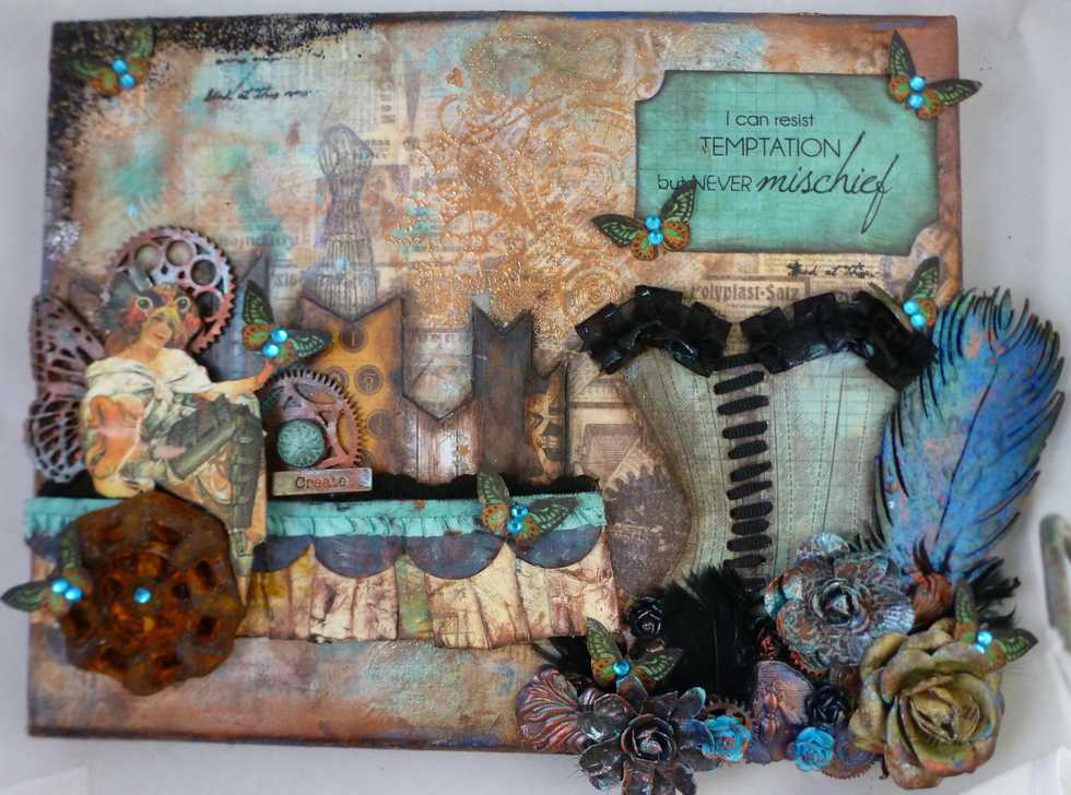 Add quote and layer embellishements. Finish with adding some paint to embellishments to tie together. Add trim to top of corset.