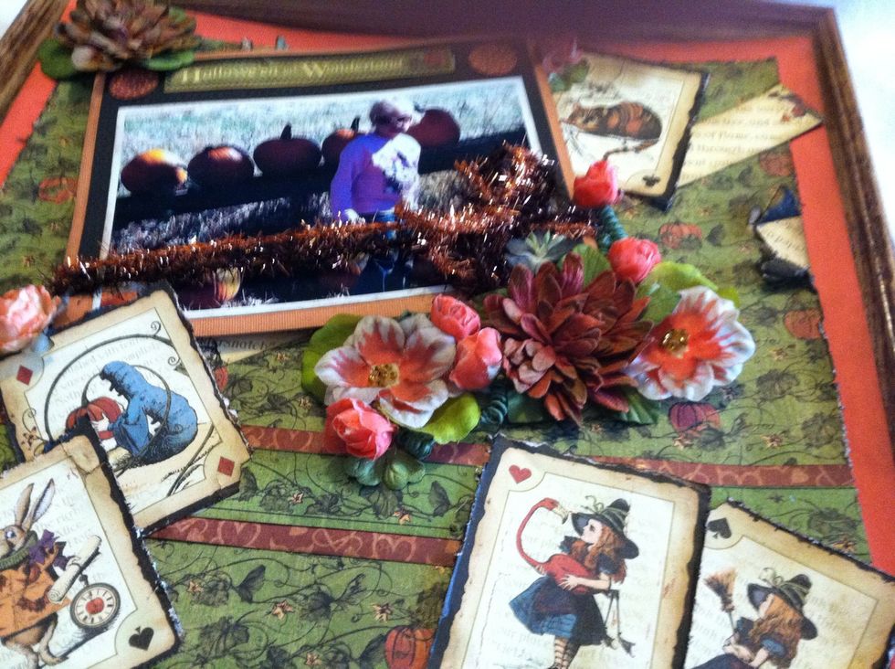 I used black and light orange card stock to mat the photo. Then I added pieces from the cut apart page of the collection. I tied two colors of tinsel twine around the bottom of the photo.