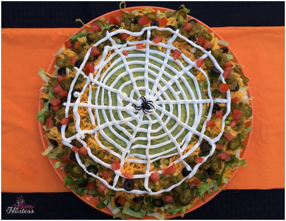 Spoon some sour cream into a zip top back and cut the corner. Carefully pipe concentric circles around the dip and then pipe the lines from the center out. Finish with a spooky spider in the middle!