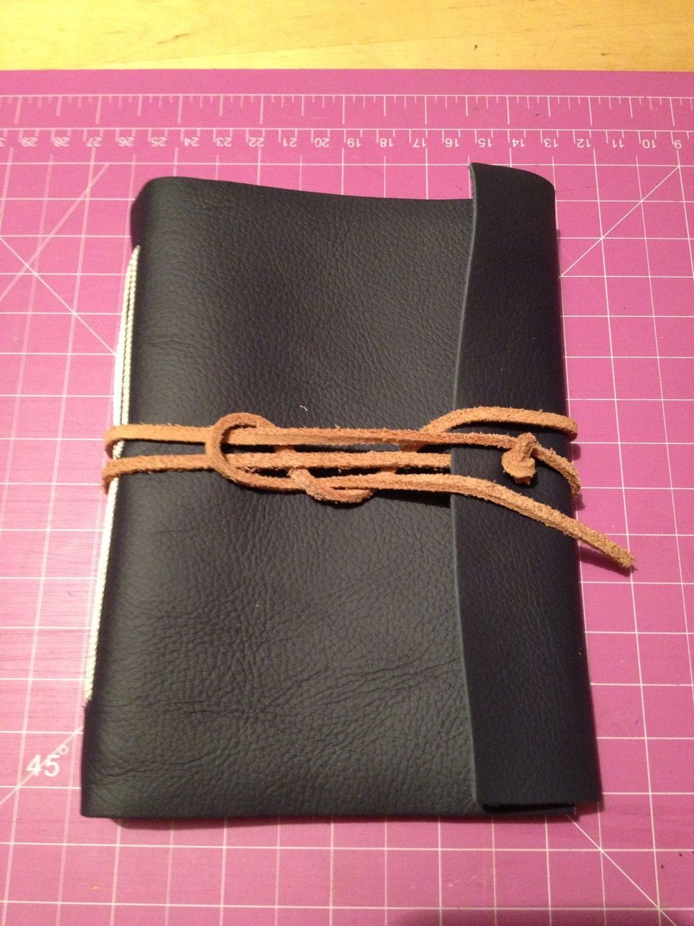 So to close my book I made the backside LP 3 inches longer so it wraps the pages. So I made a small slit in the centre and knotted a long piece of leather string to wrap around the book.