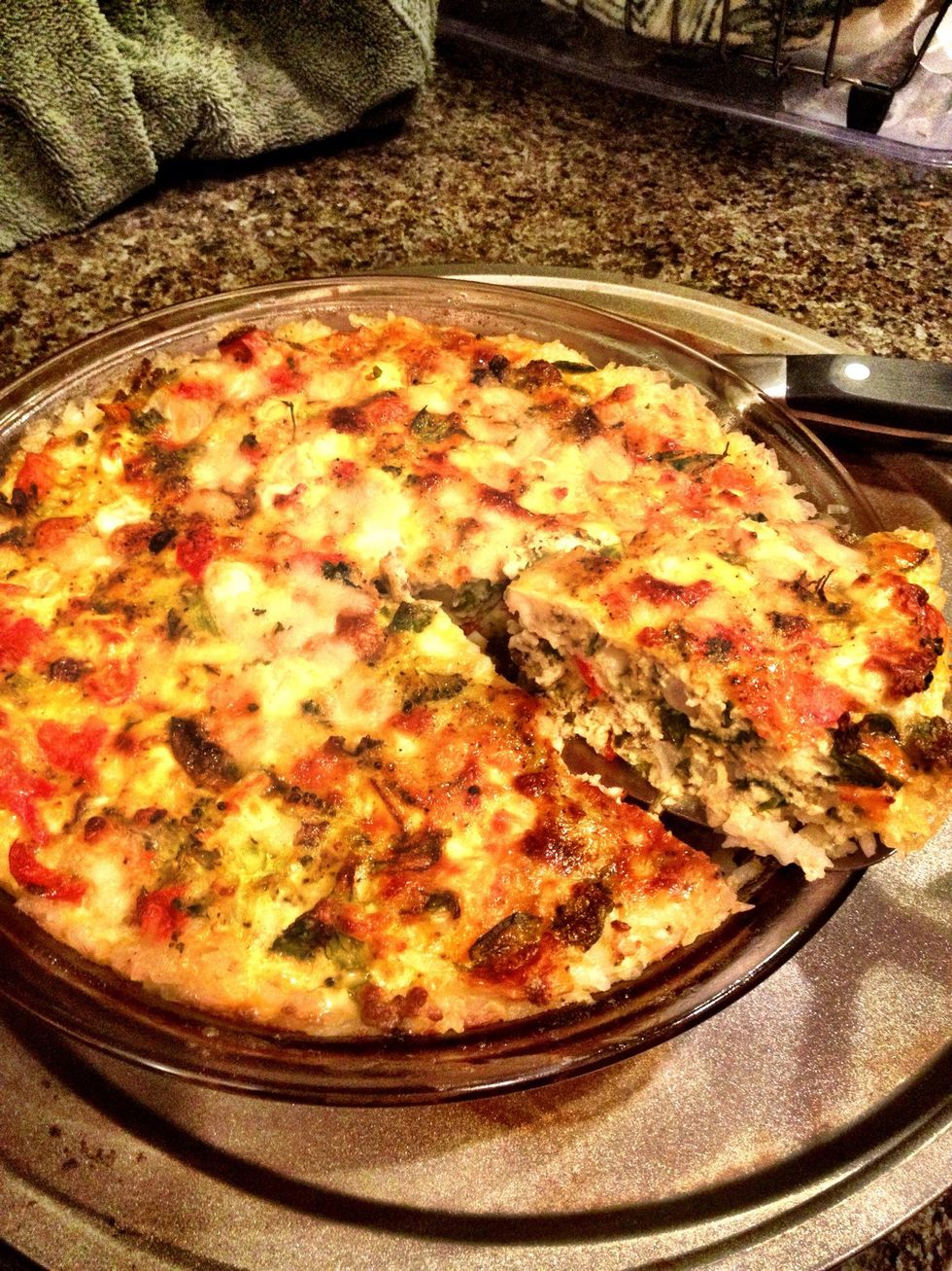 Veggies🍅🔪 Chop veggies & mix all ingredients with 4 eggs🙌Line rice around pie pan and add mixture to center. Sprinkle cheeses☝ Bake at 350 degrees🔥End result! Bon appetit👌