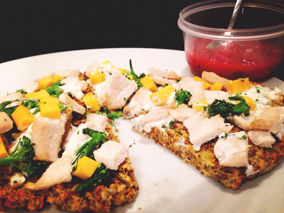 Take the dough out of the oven. Spread the low fat cream cheese, broccoli, butternut squash and chicken on the pizza. Heat for 7-10 mins.