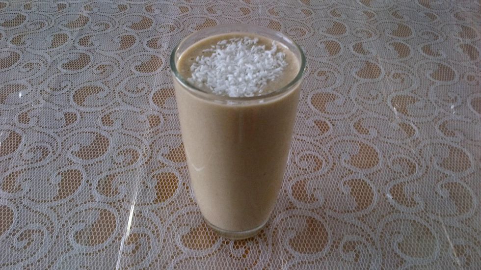 Pour smoothie into tall glass and garnish with desiccated coconut -- enjoy!