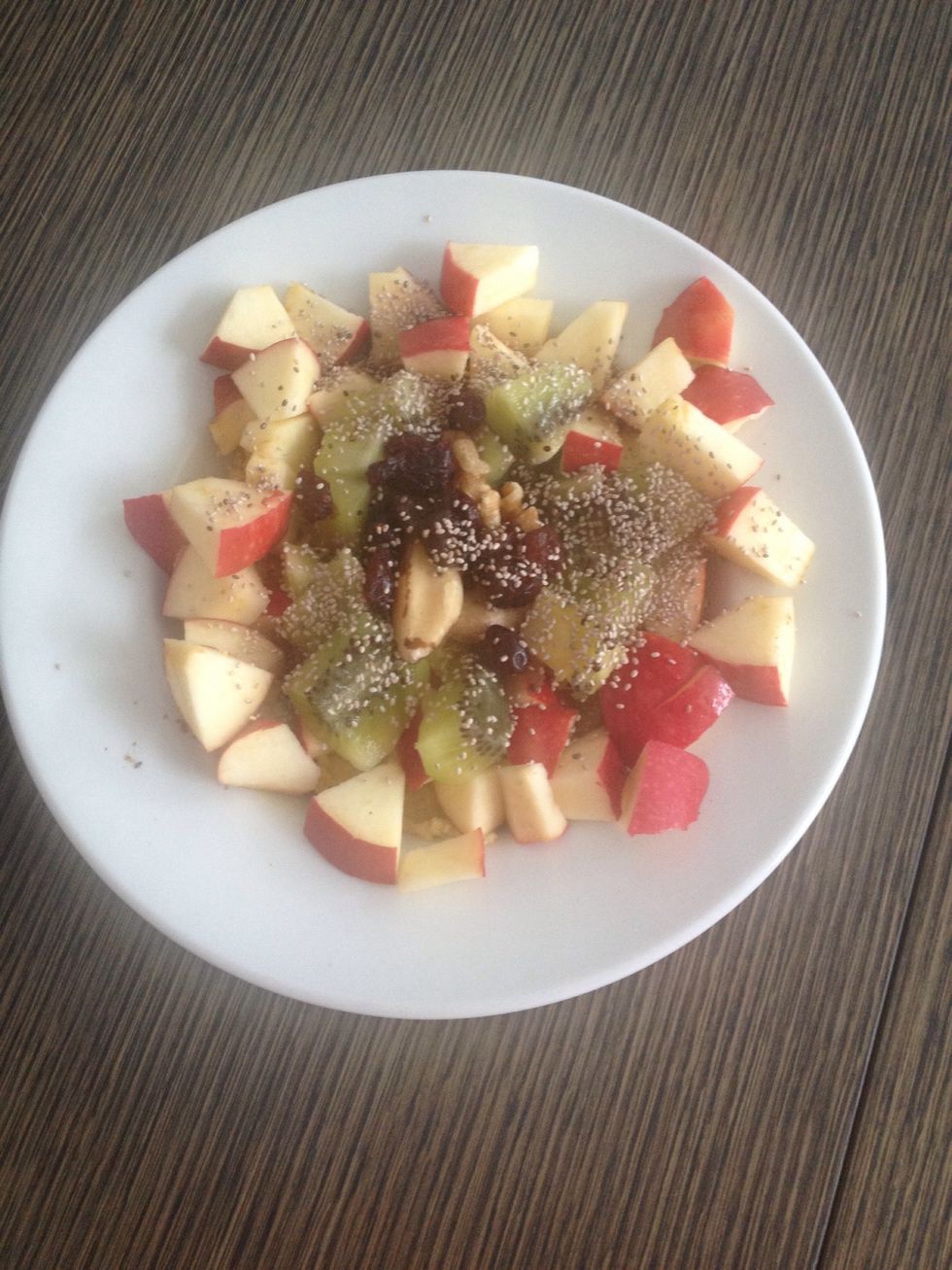 Top your semolina with cinnamon, vanilla extract ( optional), your fruits, walnuts ( or other nuts) , cranberries and chia seeds (optional). ENJOY! ✌️🙊💕
