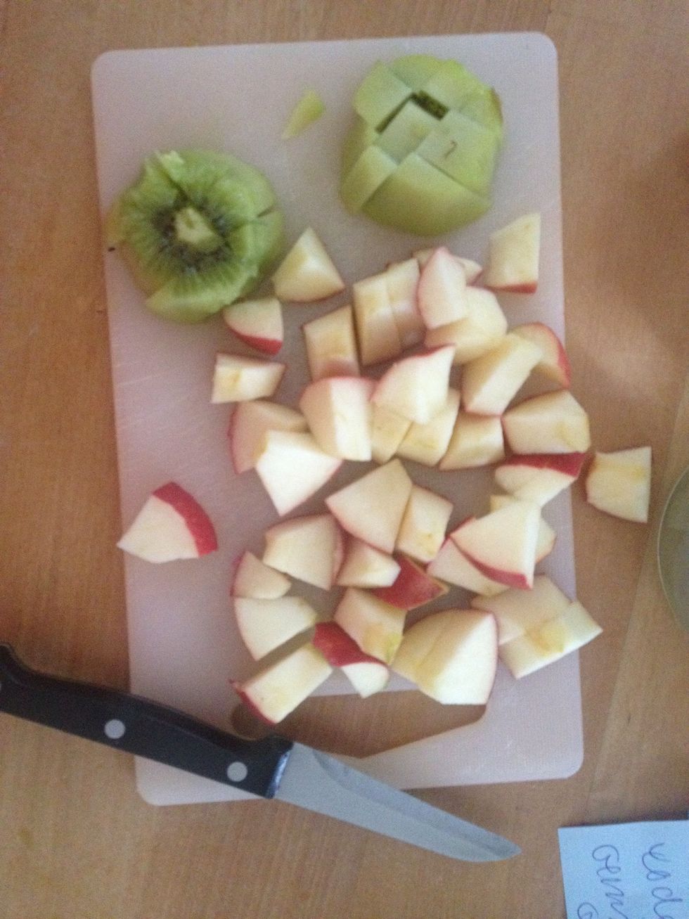 While the milk is warming up you cut your fruits ( e.g. Apples, Kiwis, Bananas..) in little slices.