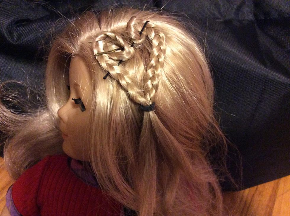 Take the front braid and twirl it in towards the other braid and pin it on the outside. And again to the other braid. Take your last rubber band and tie the 2 braids together.